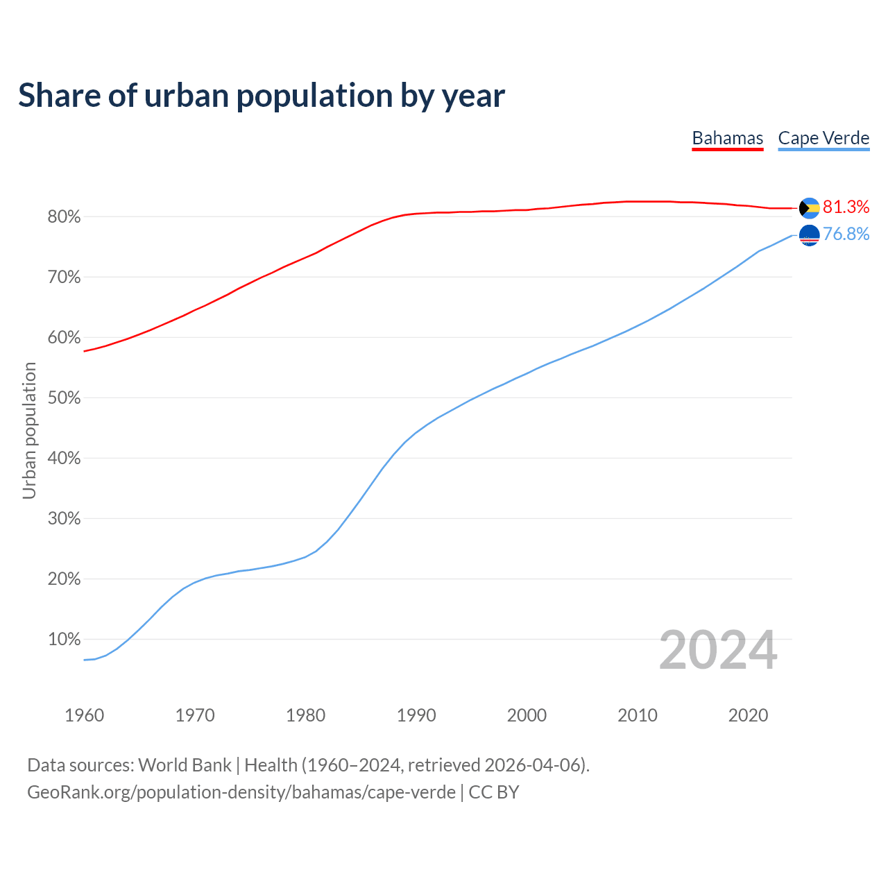 From 2004 to 2024, the share of urban population changed from 81.7% to 81.3% in the Bahamas and from 57.1% to 76.8% in Cape Verde.