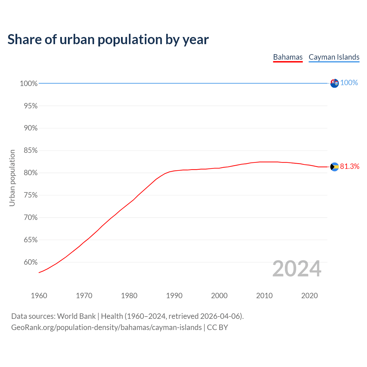 From 2004 to 2024, the share of urban population changed from 81.7% to 81.3% in the Bahamas and from 100% to 100% in the Cayman Islands.