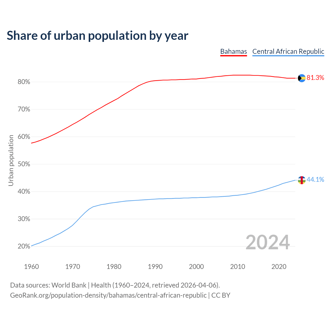 From 2004 to 2024, the share of urban population changed from 81.7% to 81.3% in the Bahamas and from 38% to 44.1% in the Central African Republic.