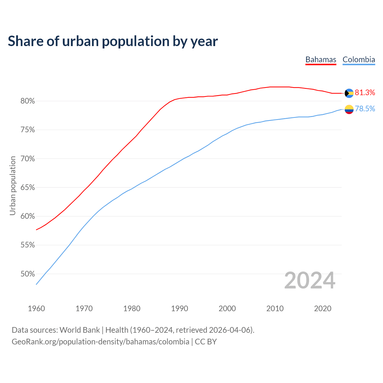 From 2004 to 2024, the share of urban population changed from 81.7% to 81.3% in the Bahamas and from 75.8% to 78.5% in Colombia.