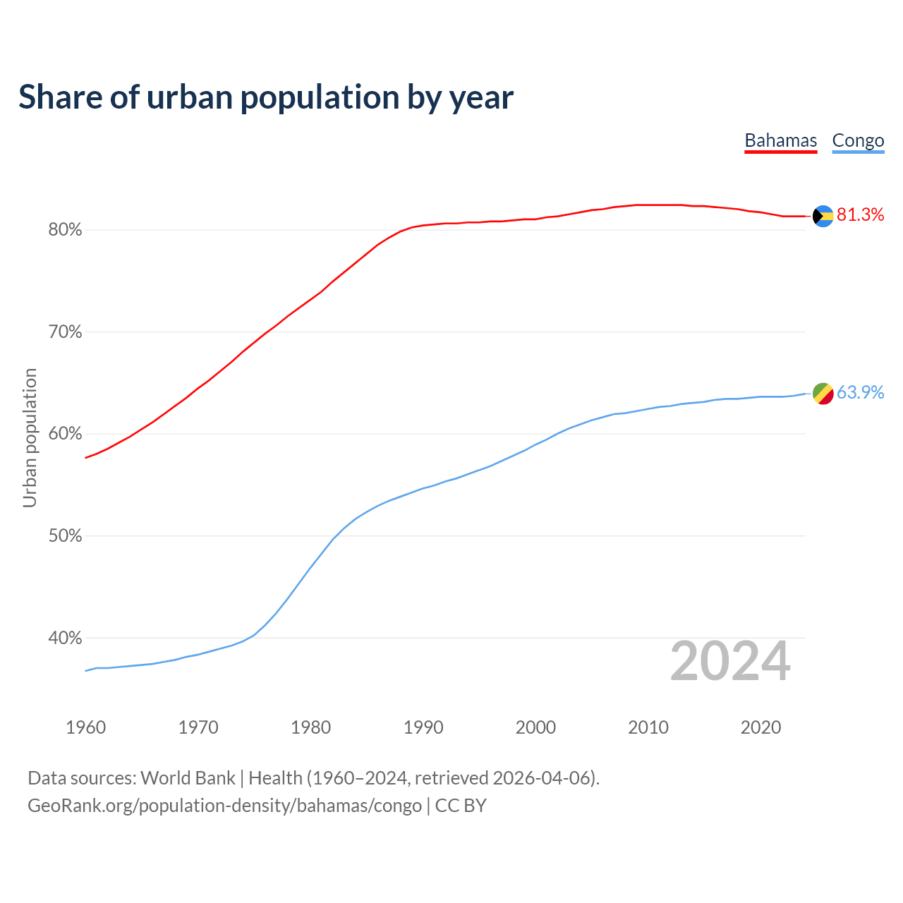 From 2004 to 2024, the share of urban population changed from 81.7% to 81.3% in the Bahamas and from 60.9% to 63.9% in the Congo.