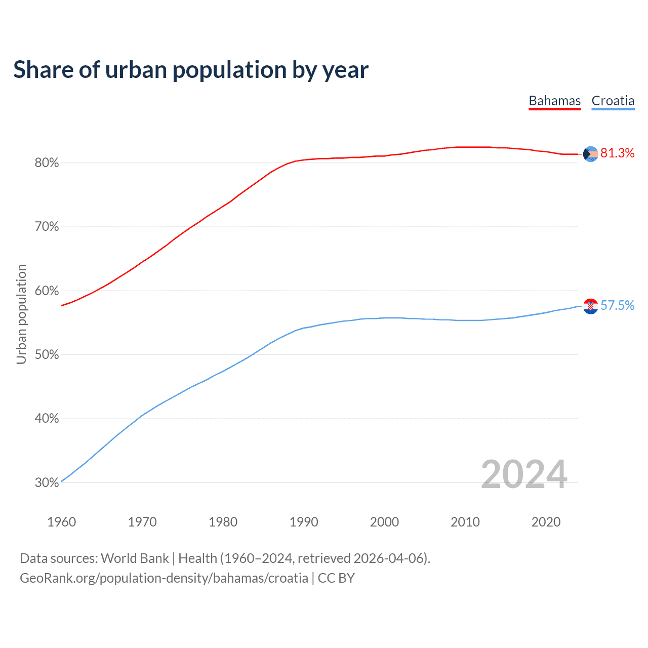 From 2004 to 2024, the share of urban population changed from 81.7% to 81.3% in the Bahamas and from 55.6% to 57.5% in Croatia.