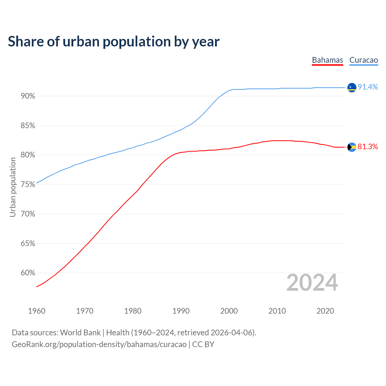 From 2004 to 2024, the share of urban population changed from 81.7% to 81.3% in the Bahamas and from 91.2% to 91.4% in Curacao.