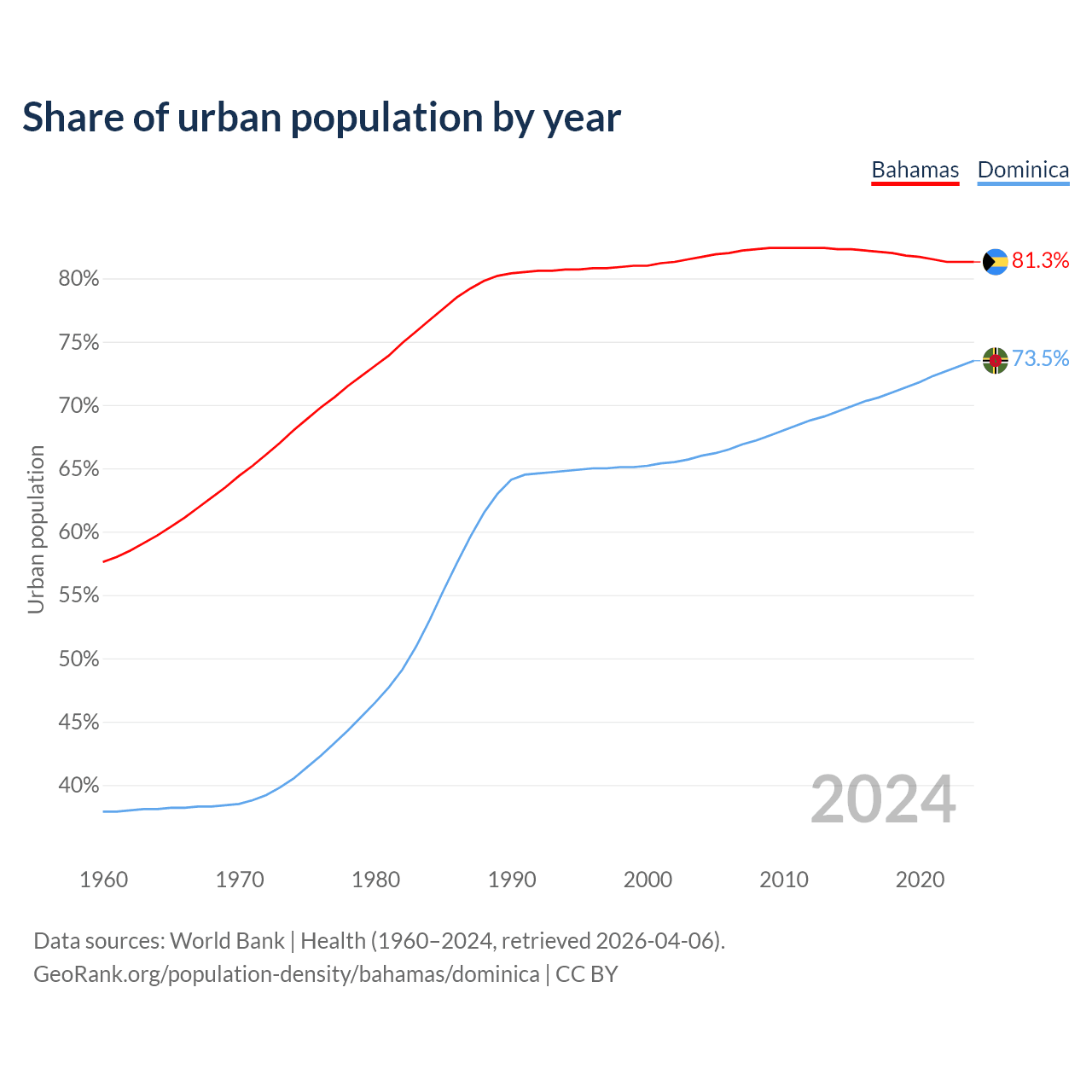 From 2004 to 2024, the share of urban population changed from 81.7% to 81.3% in the Bahamas and from 66% to 73.5% in Dominica.