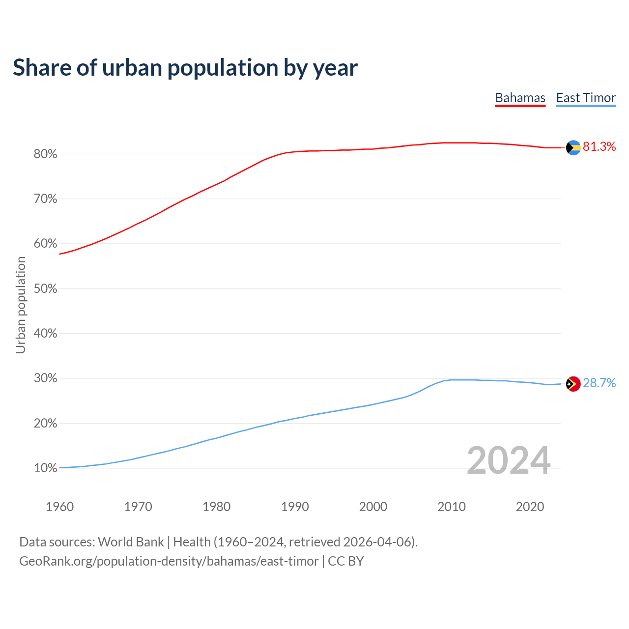 From 2004 to 2024, the share of urban population changed from 81.7% to 81.3% in the Bahamas and from 25.7% to 28.7% in East Timor.