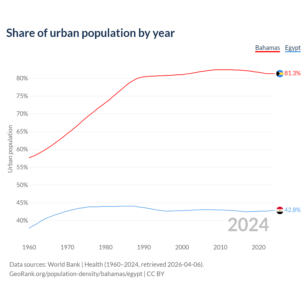 From 2004 to 2024, the share of urban population changed from 81.7% to 81.3% in the Bahamas and from 42.9% to 42.8% in Egypt.