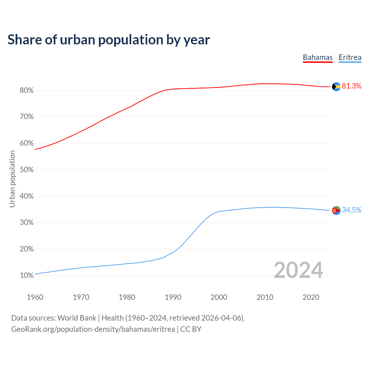 From 2004 to 2024, the share of urban population changed from 81.7% to 81.3% in the Bahamas and from 34.9% to 34.5% in Eritrea.