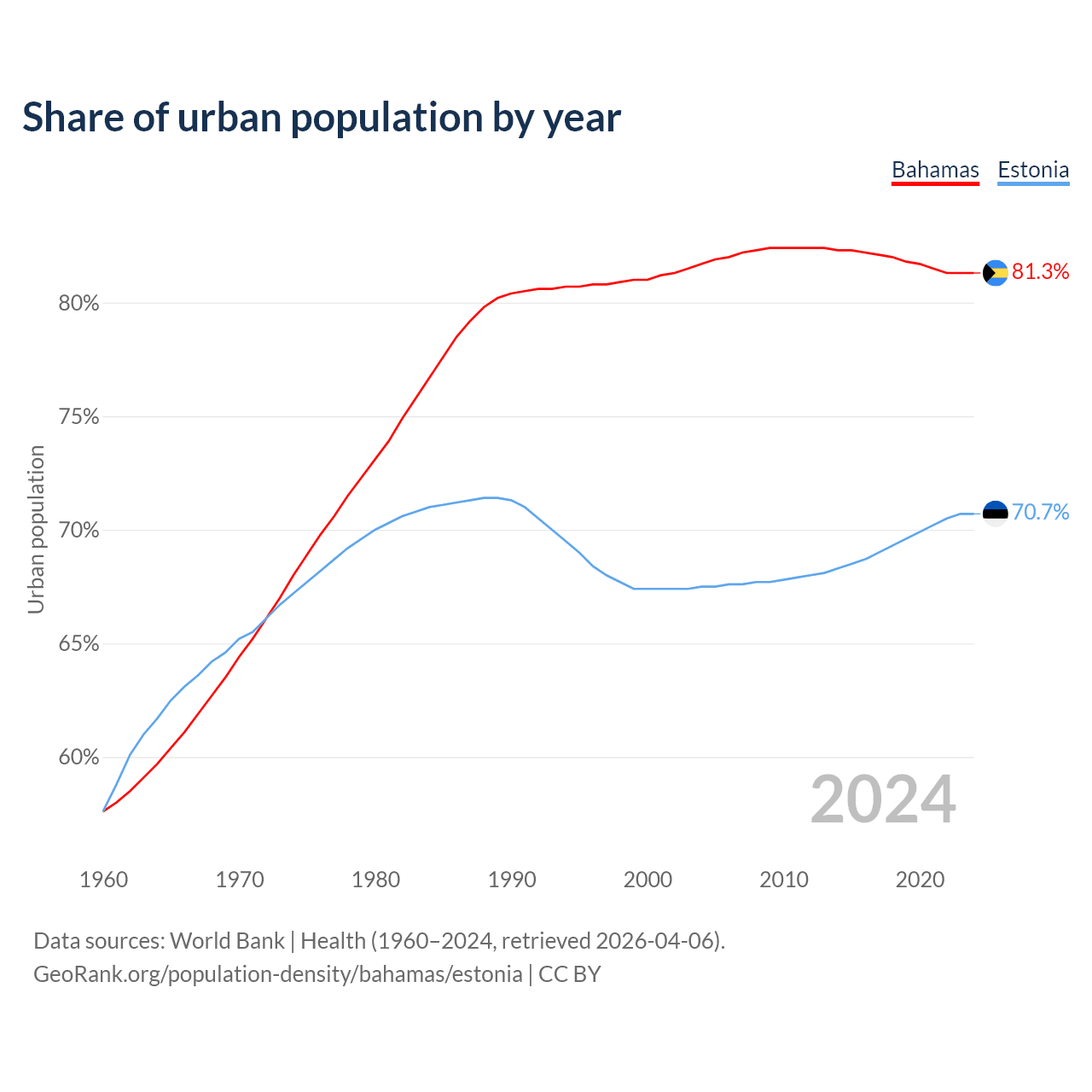 From 2004 to 2024, the share of urban population changed from 81.7% to 81.3% in the Bahamas and from 67.5% to 70.7% in Estonia.