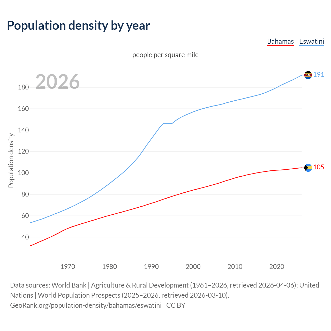 From 2006 to 2026, population density in the Bahamas increased by 16.2%, compared to a 17.1% growth in Eswatini.