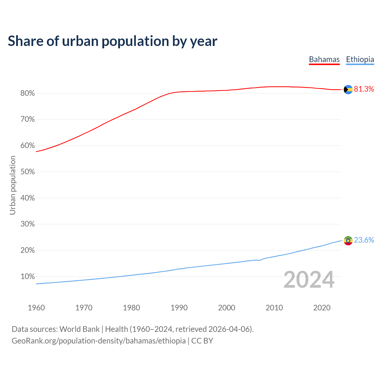 From 2004 to 2024, the share of urban population changed from 81.7% to 81.3% in the Bahamas and from 15.8% to 23.6% in Ethiopia.