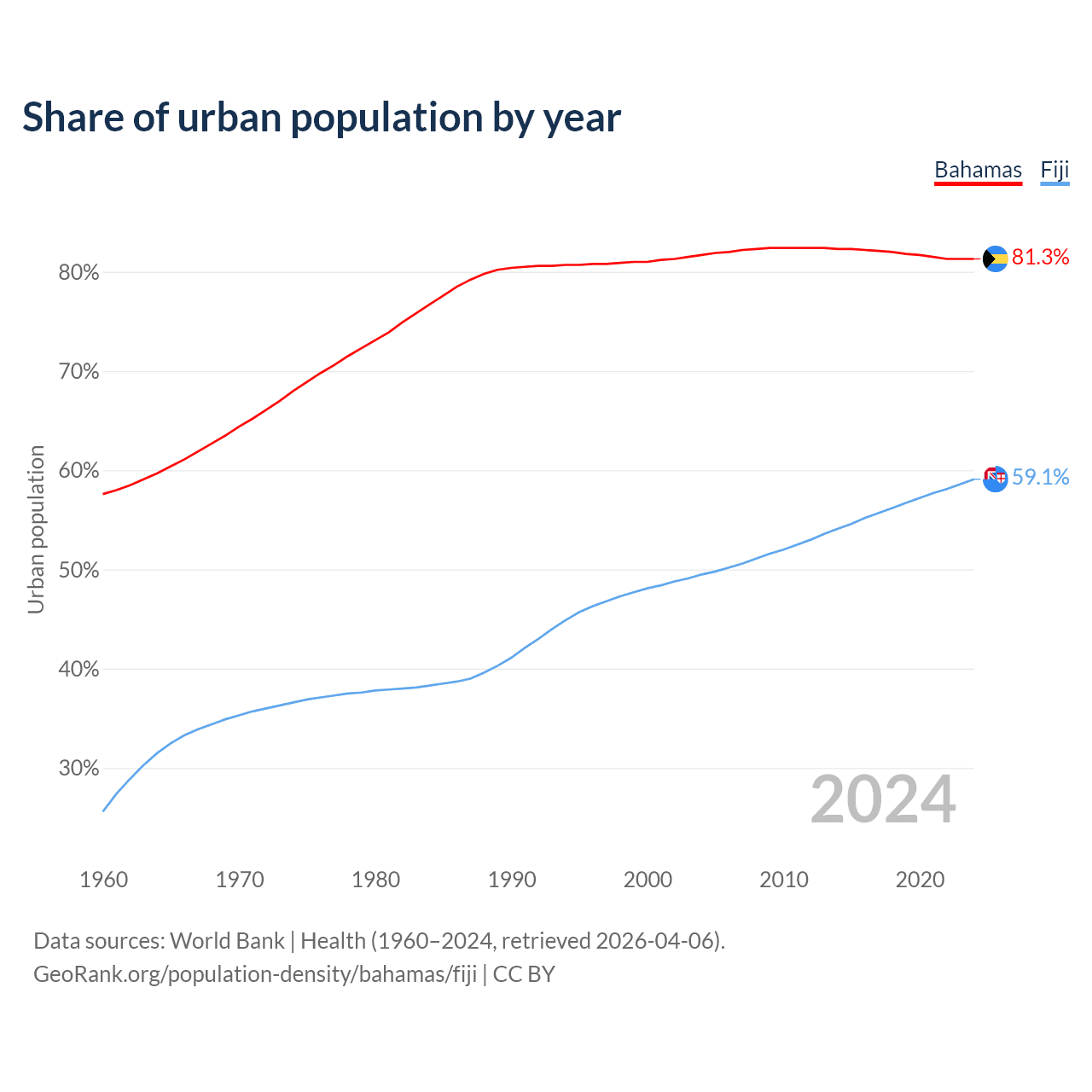 From 2004 to 2024, the share of urban population changed from 81.7% to 81.3% in the Bahamas and from 49.5% to 59.1% in Fiji.