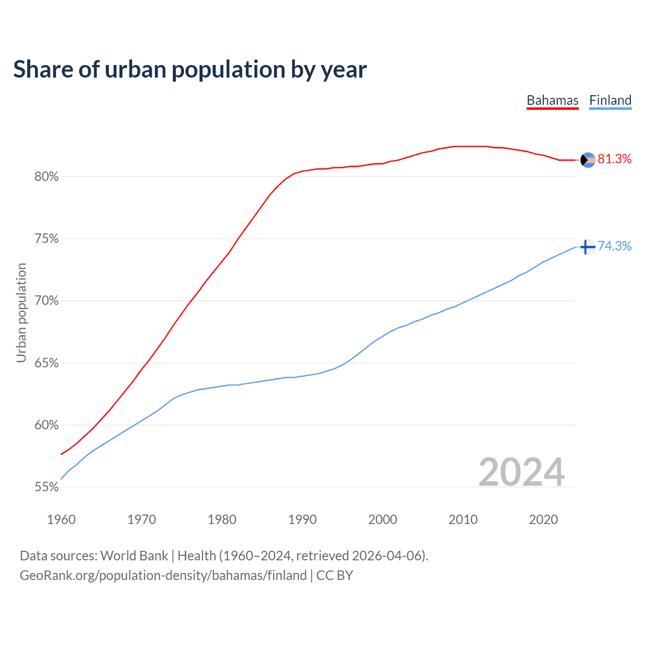 From 2004 to 2024, the share of urban population changed from 81.7% to 81.3% in the Bahamas and from 68.3% to 74.3% in Finland.