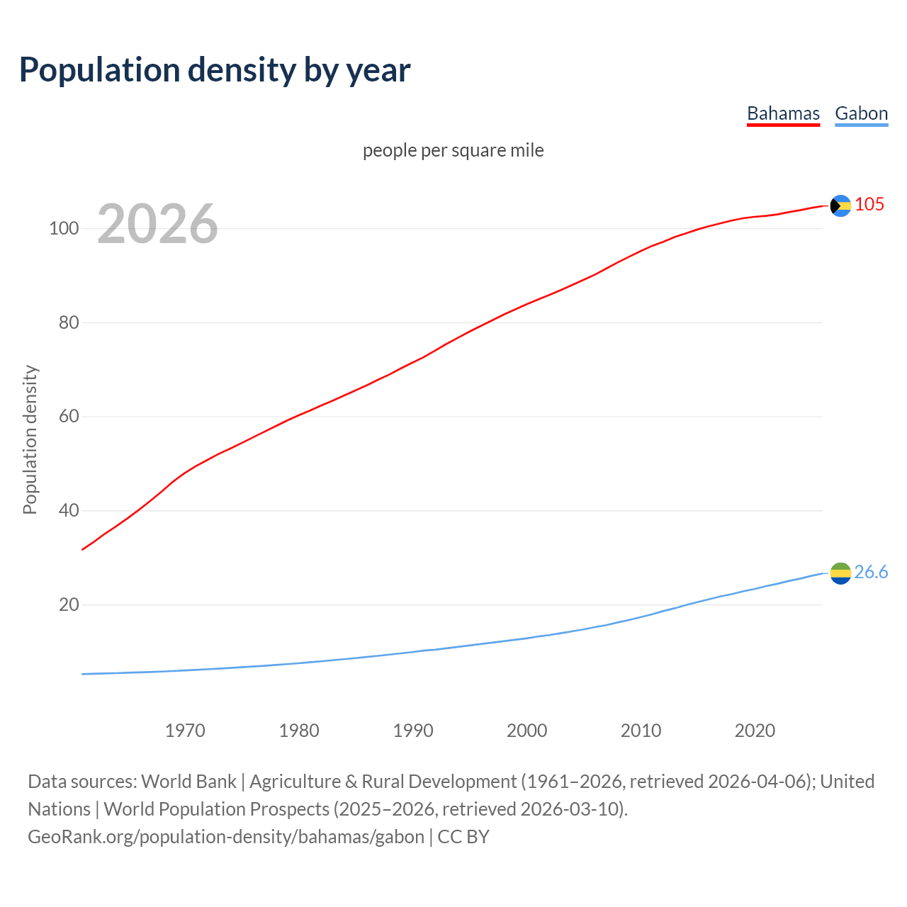 From 2006 to 2026, population density in the Bahamas increased by 16.2%, compared to a 75.6% growth in Gabon.