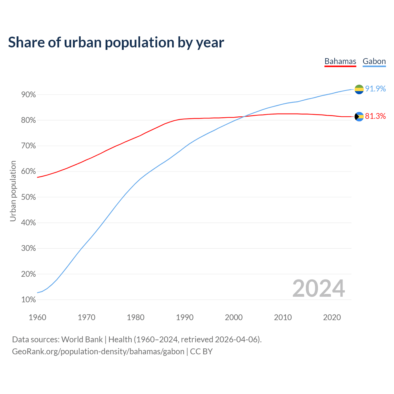 From 2004 to 2024, the share of urban population changed from 81.7% to 81.3% in the Bahamas and from 82.7% to 91.9% in Gabon.