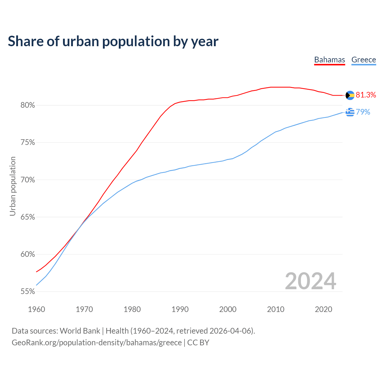 From 2004 to 2024, the share of urban population changed from 81.7% to 81.3% in the Bahamas and from 73.8% to 79% in Greece.