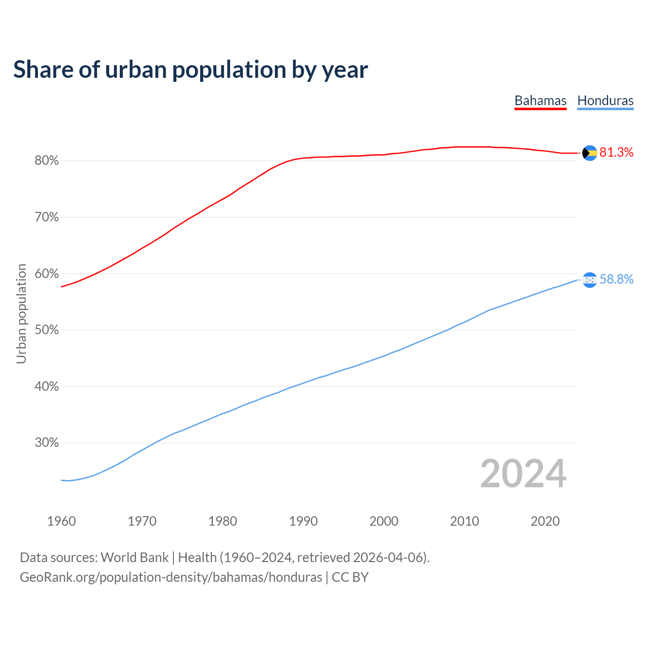 From 2004 to 2024, the share of urban population changed from 81.7% to 81.3% in the Bahamas and from 47.6% to 58.8% in Honduras.