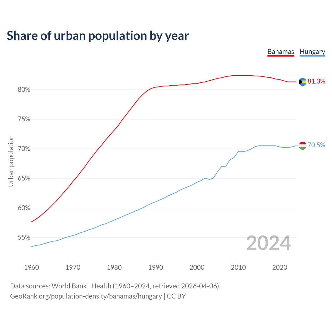 From 2004 to 2024, the share of urban population changed from 81.7% to 81.3% in the Bahamas and from 65% to 70.5% in Hungary.
