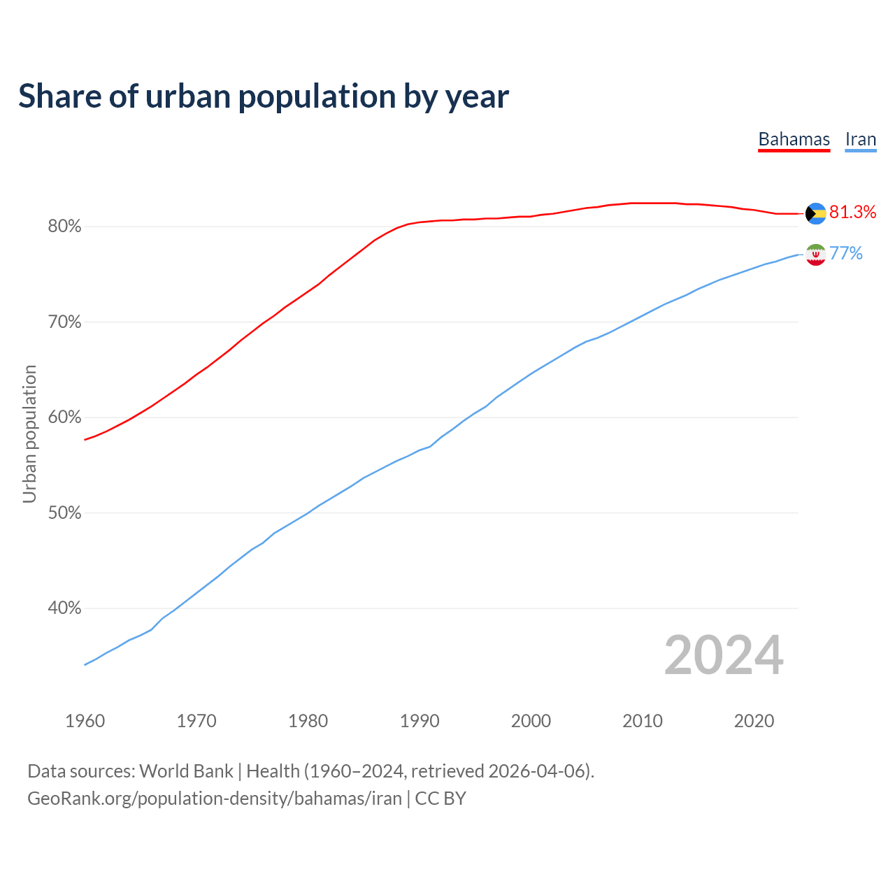 From 2004 to 2024, the share of urban population changed from 81.7% to 81.3% in the Bahamas and from 67.3% to 77% in Iran.
