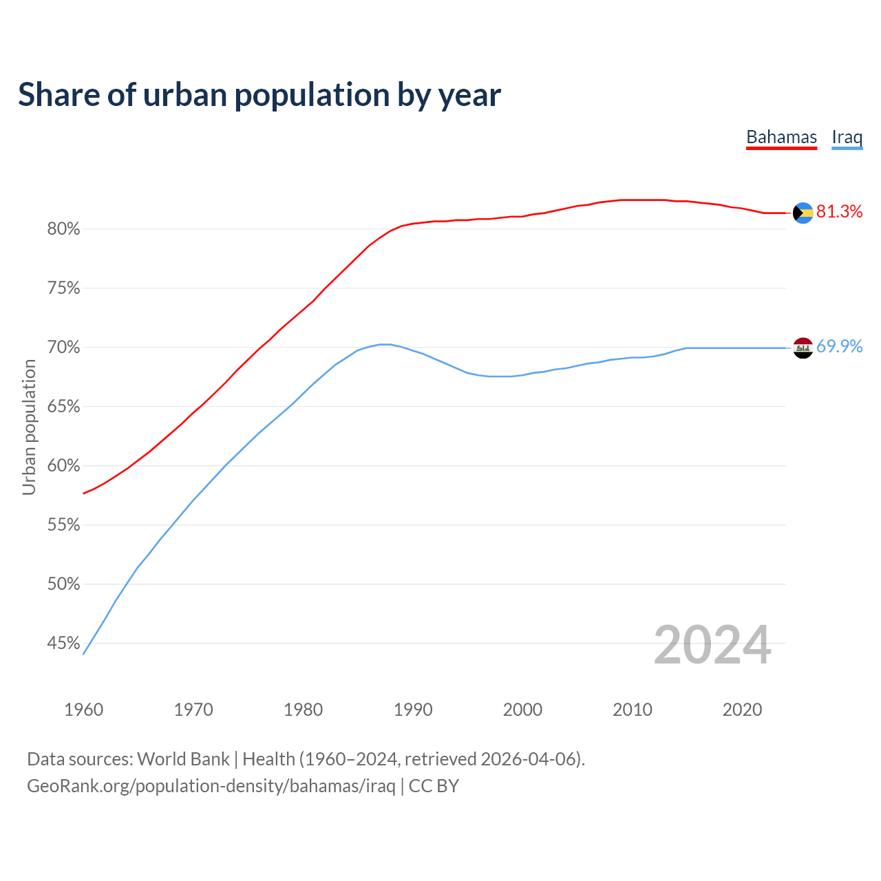 From 2004 to 2024, the share of urban population changed from 81.7% to 81.3% in the Bahamas and from 68.2% to 69.9% in Iraq.