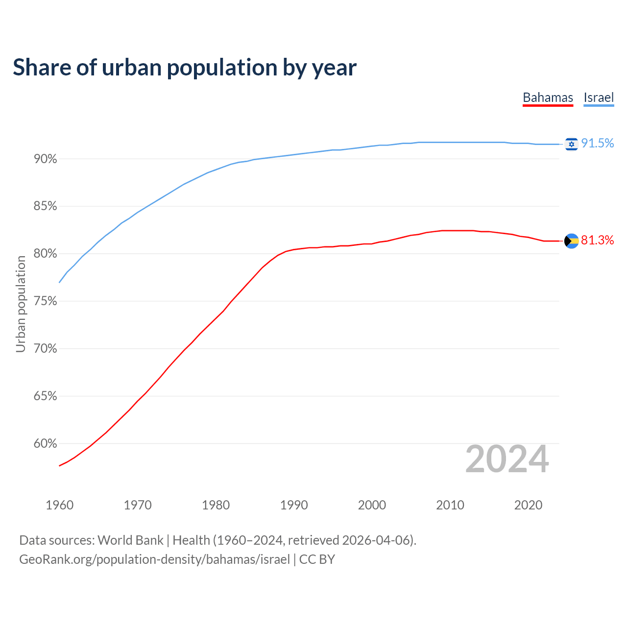 From 2004 to 2024, the share of urban population changed from 81.7% to 81.3% in the Bahamas and from 91.6% to 91.5% in Israel.
