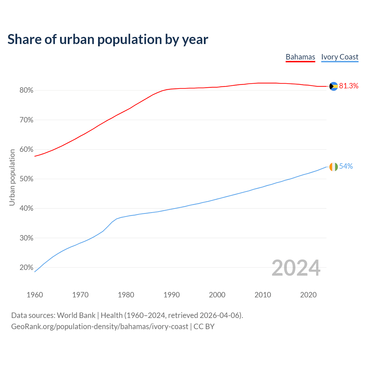 From 2004 to 2024, the share of urban population changed from 81.7% to 81.3% in the Bahamas and from 44.7% to 54% in Ivory Coast.