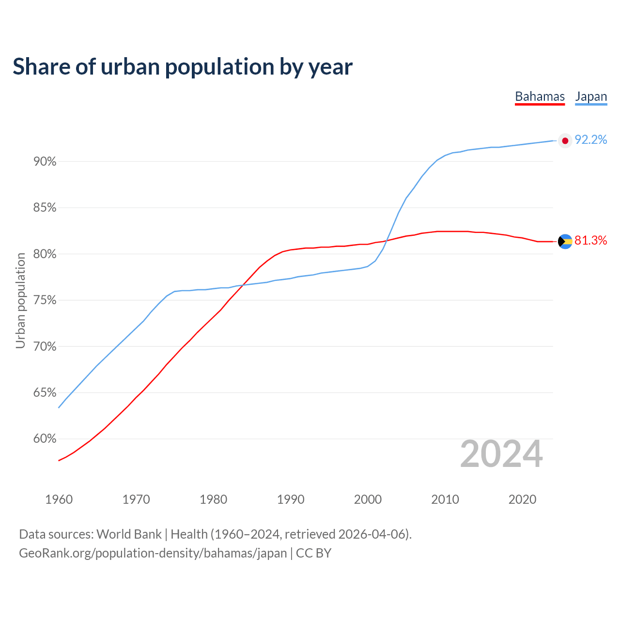 From 2004 to 2024, the share of urban population changed from 81.7% to 81.3% in the Bahamas and from 84.4% to 92.2% in Japan.