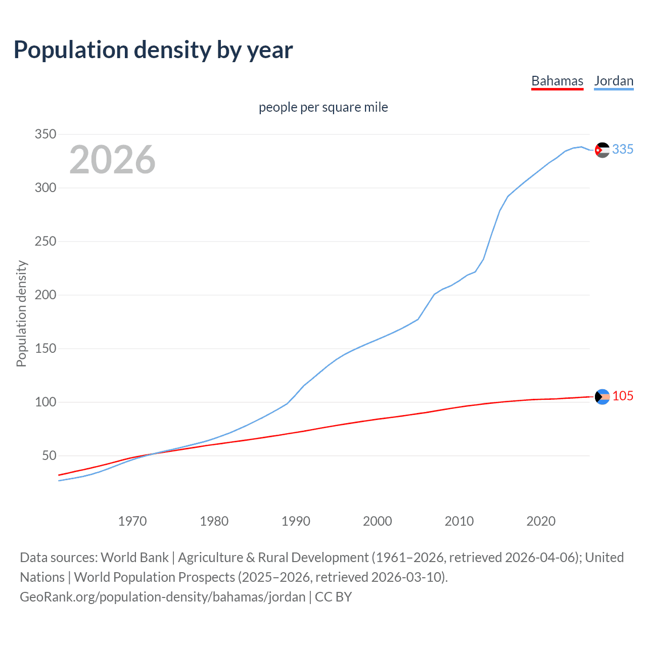 From 2006 to 2026, population density in the Bahamas increased by 16.2%, compared to a 77.6% growth in Jordan.