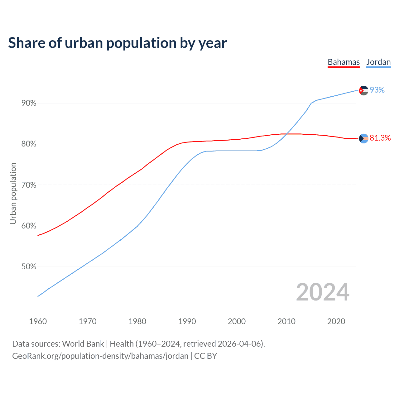 From 2004 to 2024, the share of urban population changed from 81.7% to 81.3% in the Bahamas and from 78.3% to 93% in Jordan.