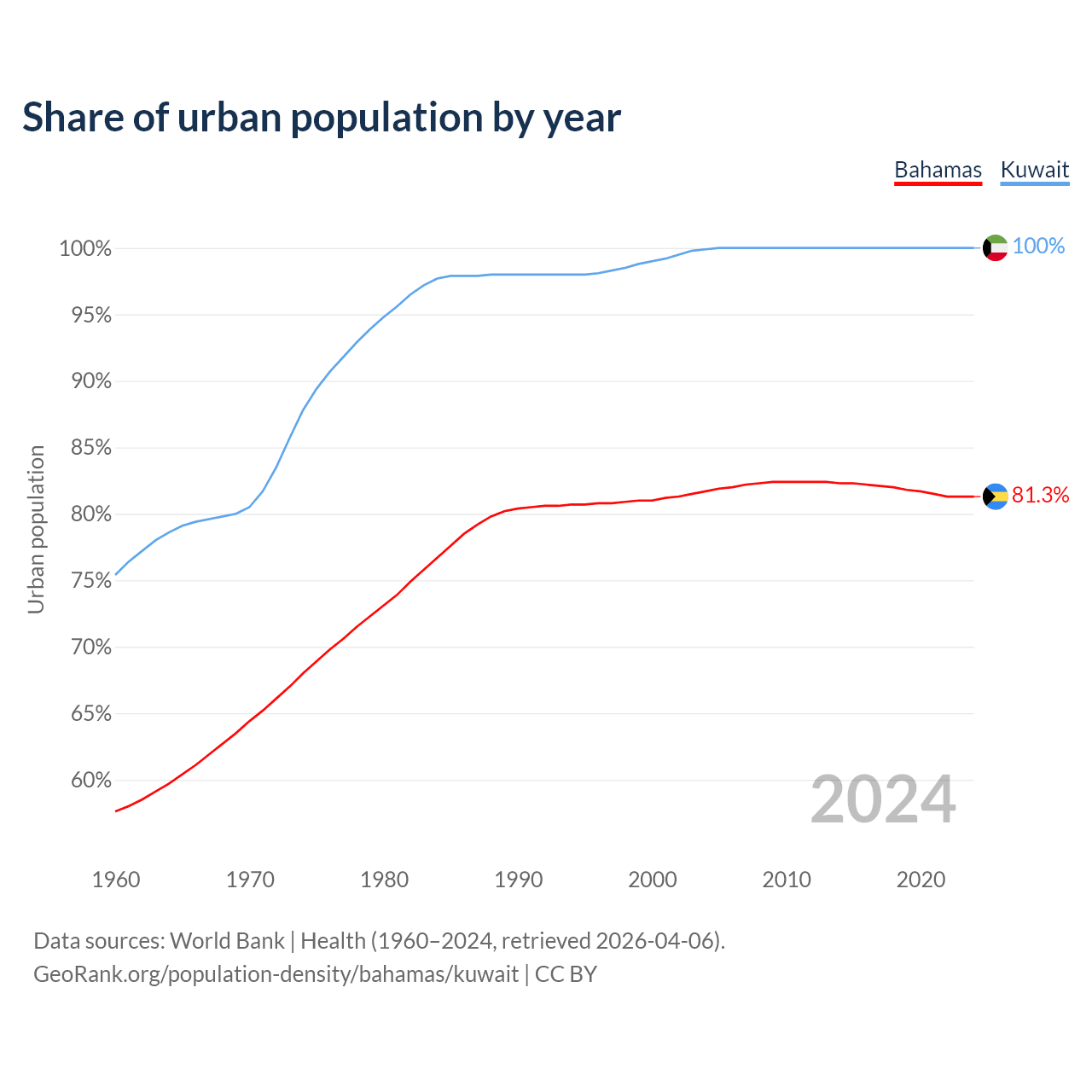 From 2004 to 2024, the share of urban population changed from 81.7% to 81.3% in the Bahamas and from 99.9% to 100% in Kuwait.
