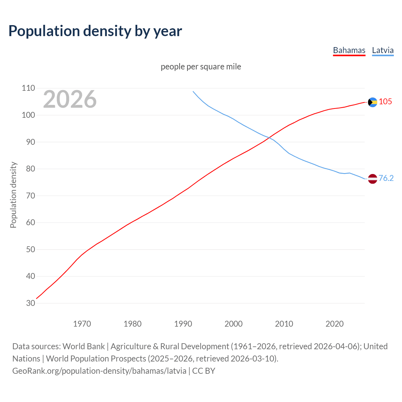 From 2006 to 2026, population density in the Bahamas increased by 16.2%, compared to a 17.5% decline in Latvia.