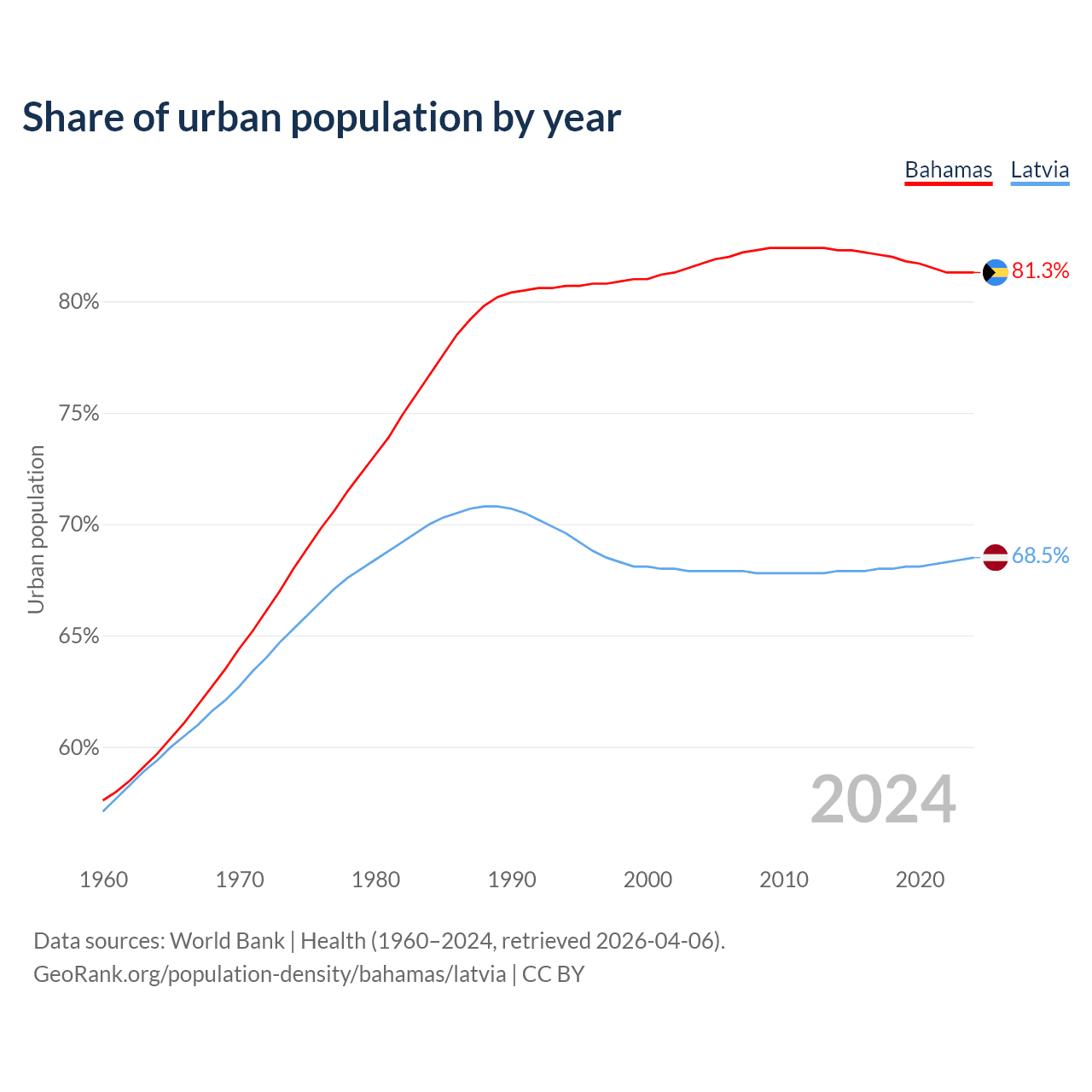 From 2004 to 2024, the share of urban population changed from 81.7% to 81.3% in the Bahamas and from 67.9% to 68.5% in Latvia.