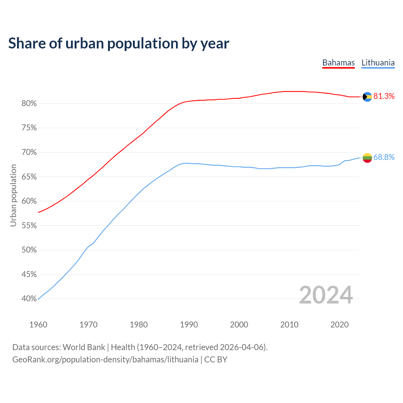From 2004 to 2024, the share of urban population changed from 81.7% to 81.3% in the Bahamas and from 66.6% to 68.8% in Lithuania.