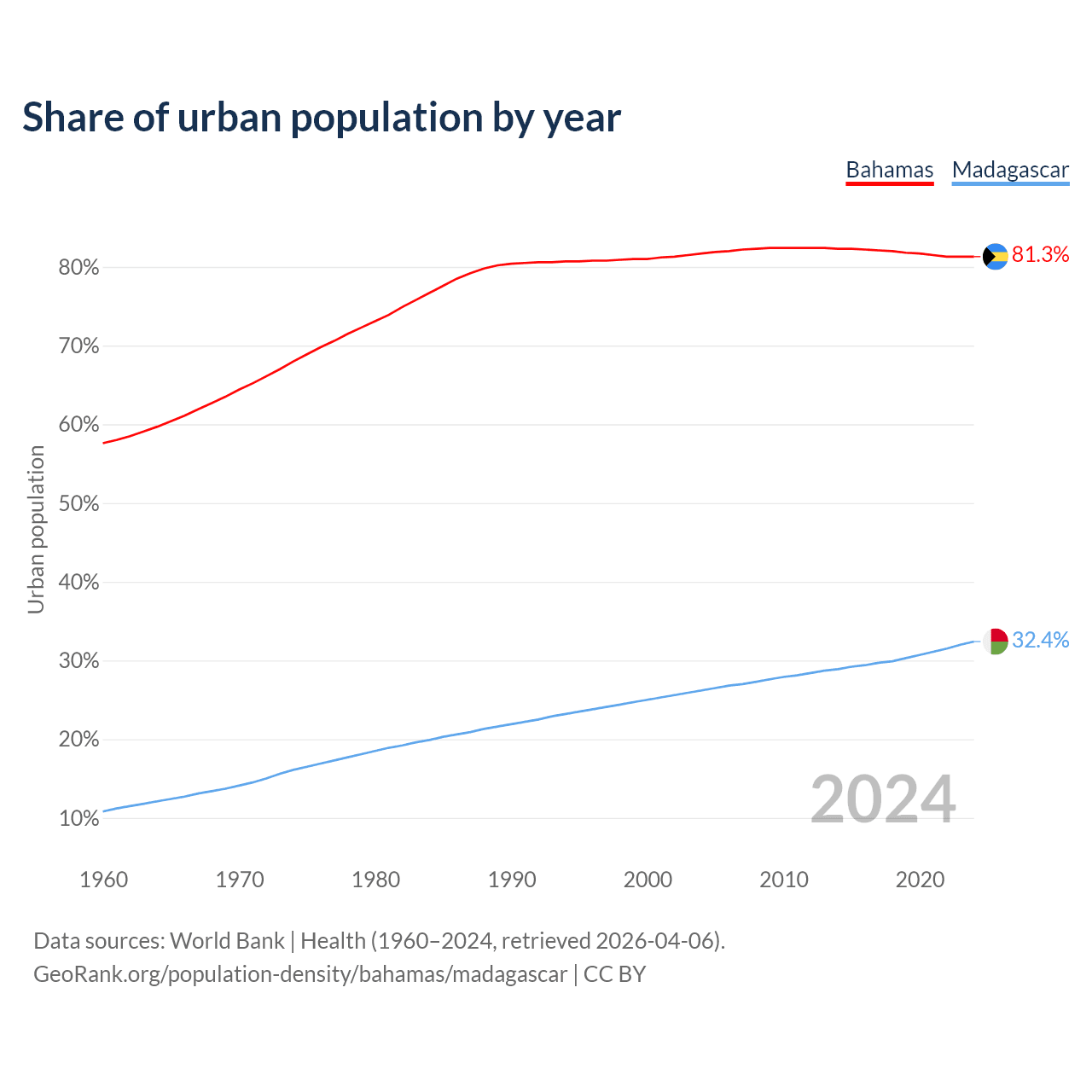 From 2004 to 2024, the share of urban population changed from 81.7% to 81.3% in the Bahamas and from 26.2% to 32.4% in Madagascar.