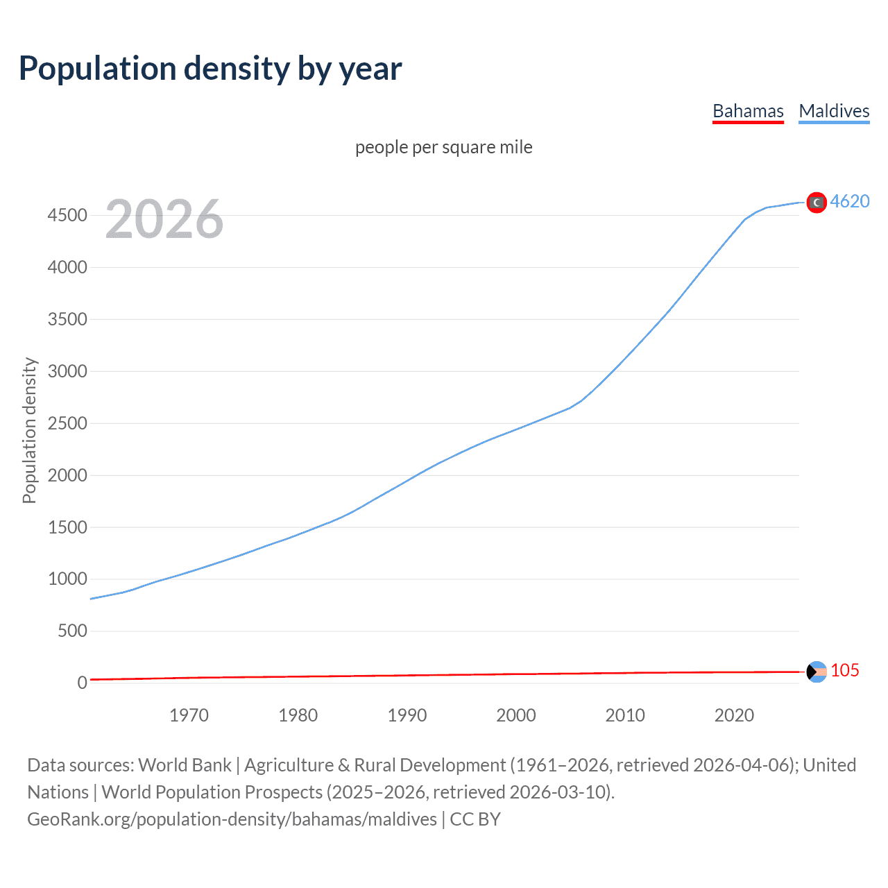 From 2006 to 2026, population density in the Bahamas increased by 16.2%, compared to a 70.5% growth in Maldives.