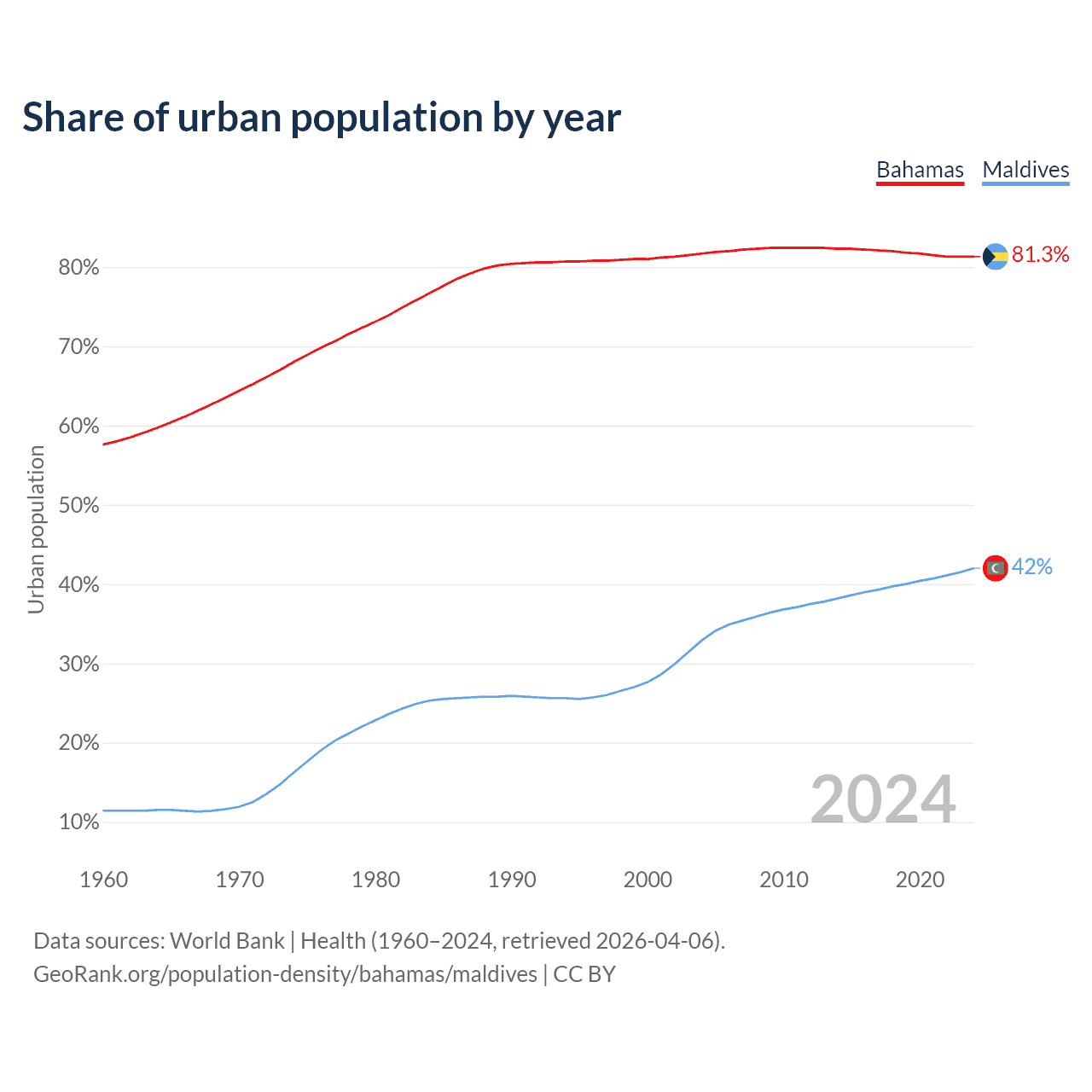 From 2004 to 2024, the share of urban population changed from 81.7% to 81.3% in the Bahamas and from 32.9% to 42% in Maldives.