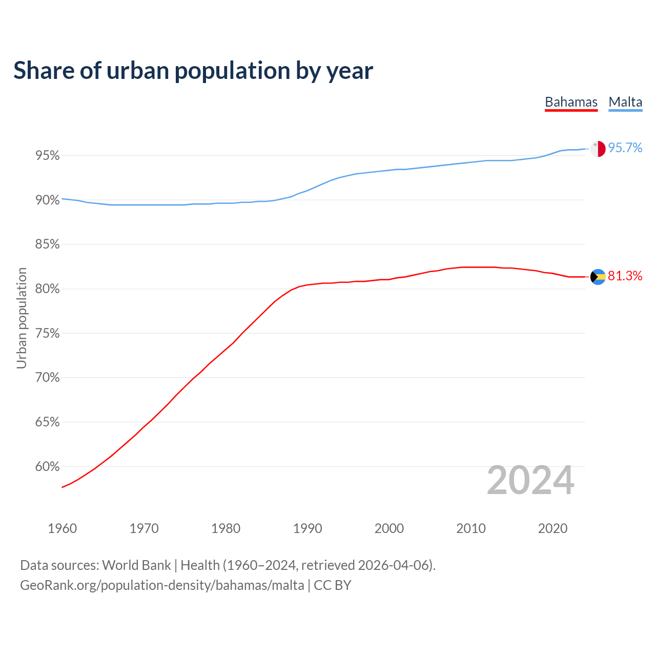 From 2004 to 2024, the share of urban population changed from 81.7% to 81.3% in the Bahamas and from 93.6% to 95.7% in Malta.