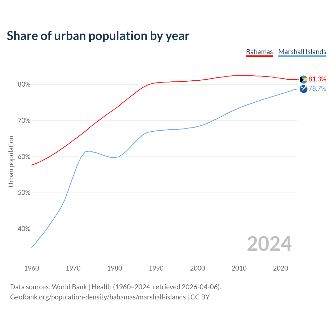 From 2004 to 2024, the share of urban population changed from 81.7% to 81.3% in the Bahamas and from 70.1% to 78.7% in the Marshall Islands.