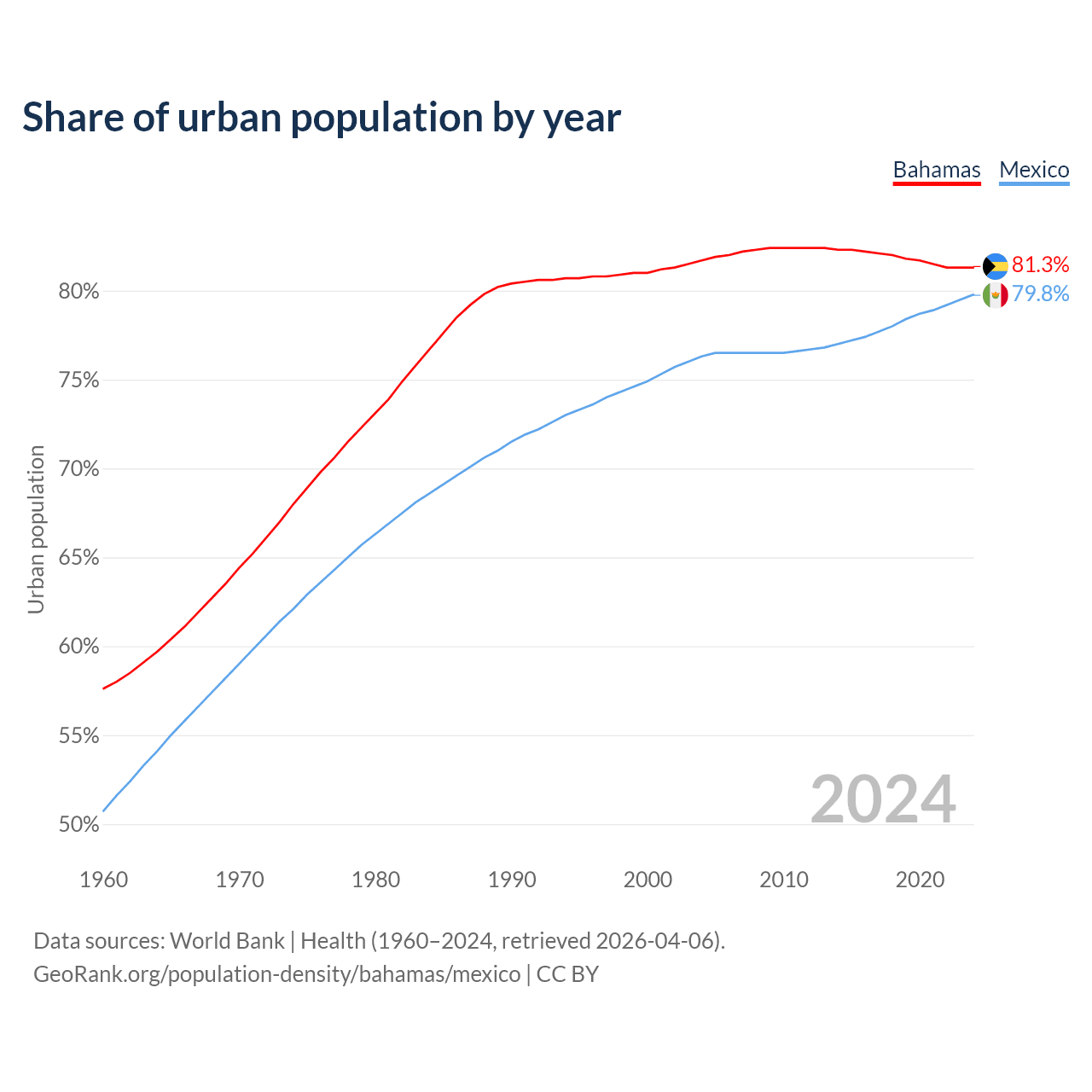 From 2004 to 2024, the share of urban population changed from 81.7% to 81.3% in the Bahamas and from 76.3% to 79.8% in Mexico.