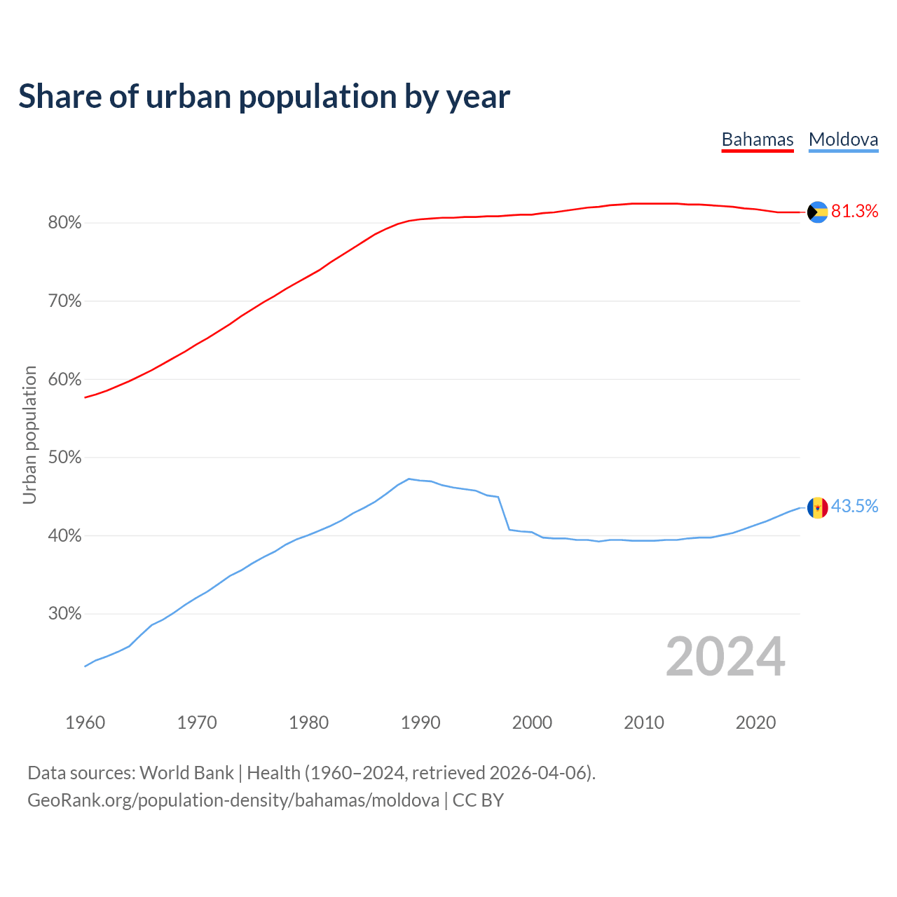 From 2004 to 2024, the share of urban population changed from 81.7% to 81.3% in the Bahamas and from 39.4% to 43.5% in Moldova.
