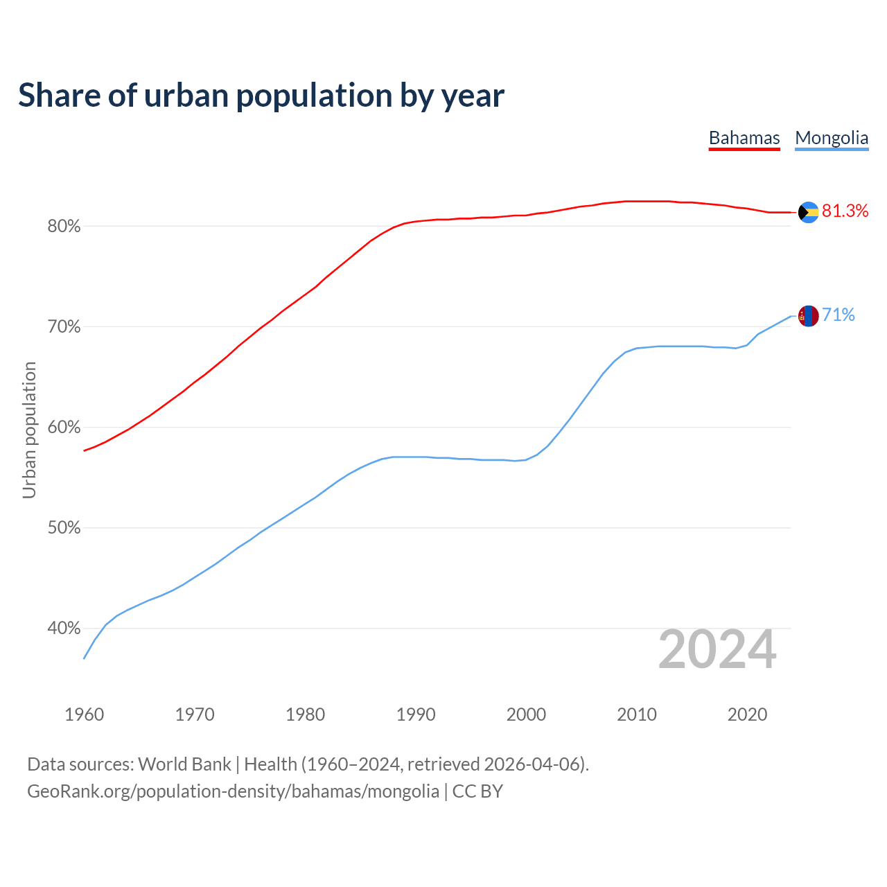 From 2004 to 2024, the share of urban population changed from 81.7% to 81.3% in the Bahamas and from 60.8% to 71% in Mongolia.