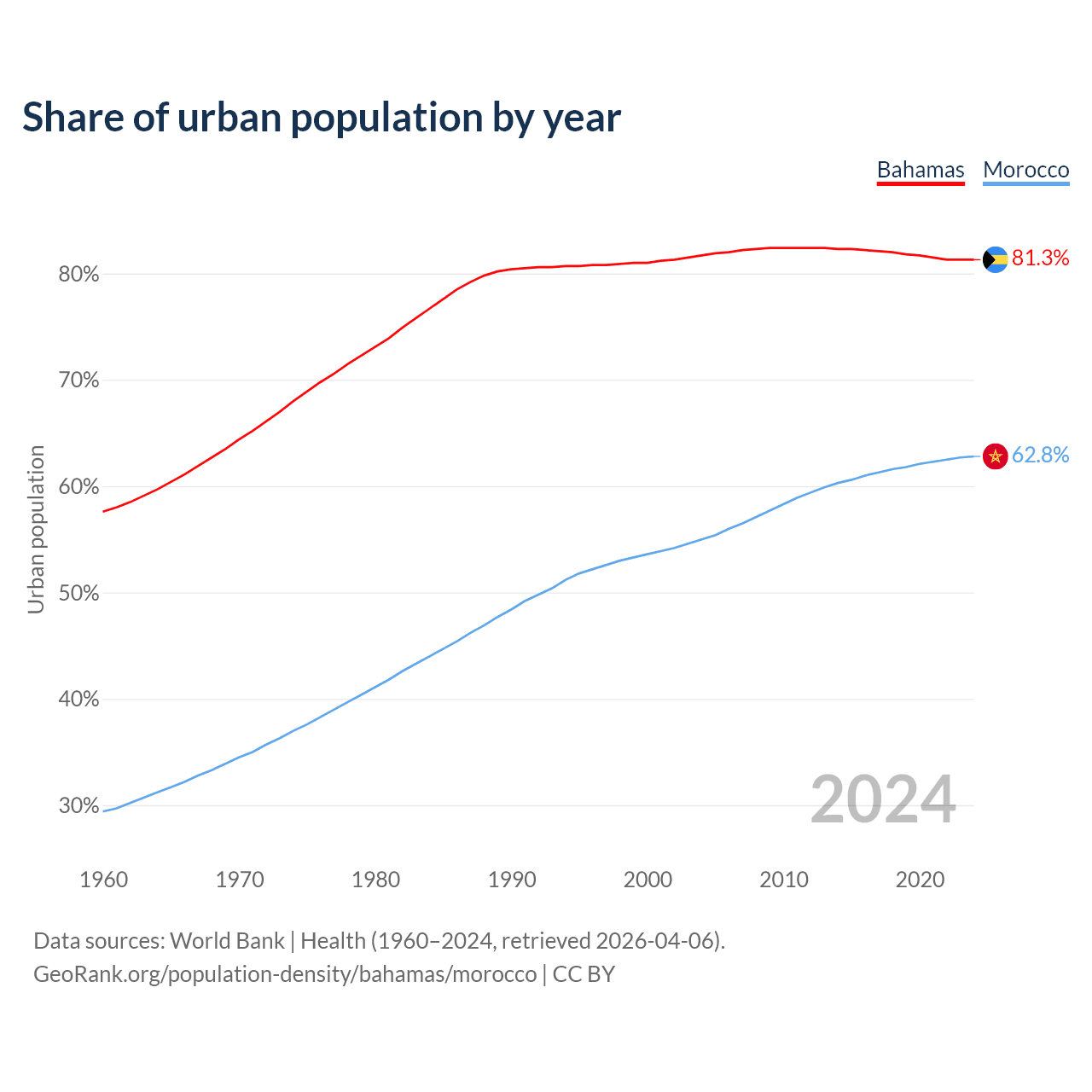 From 2004 to 2024, the share of urban population changed from 81.7% to 81.3% in the Bahamas and from 55% to 62.8% in Morocco.