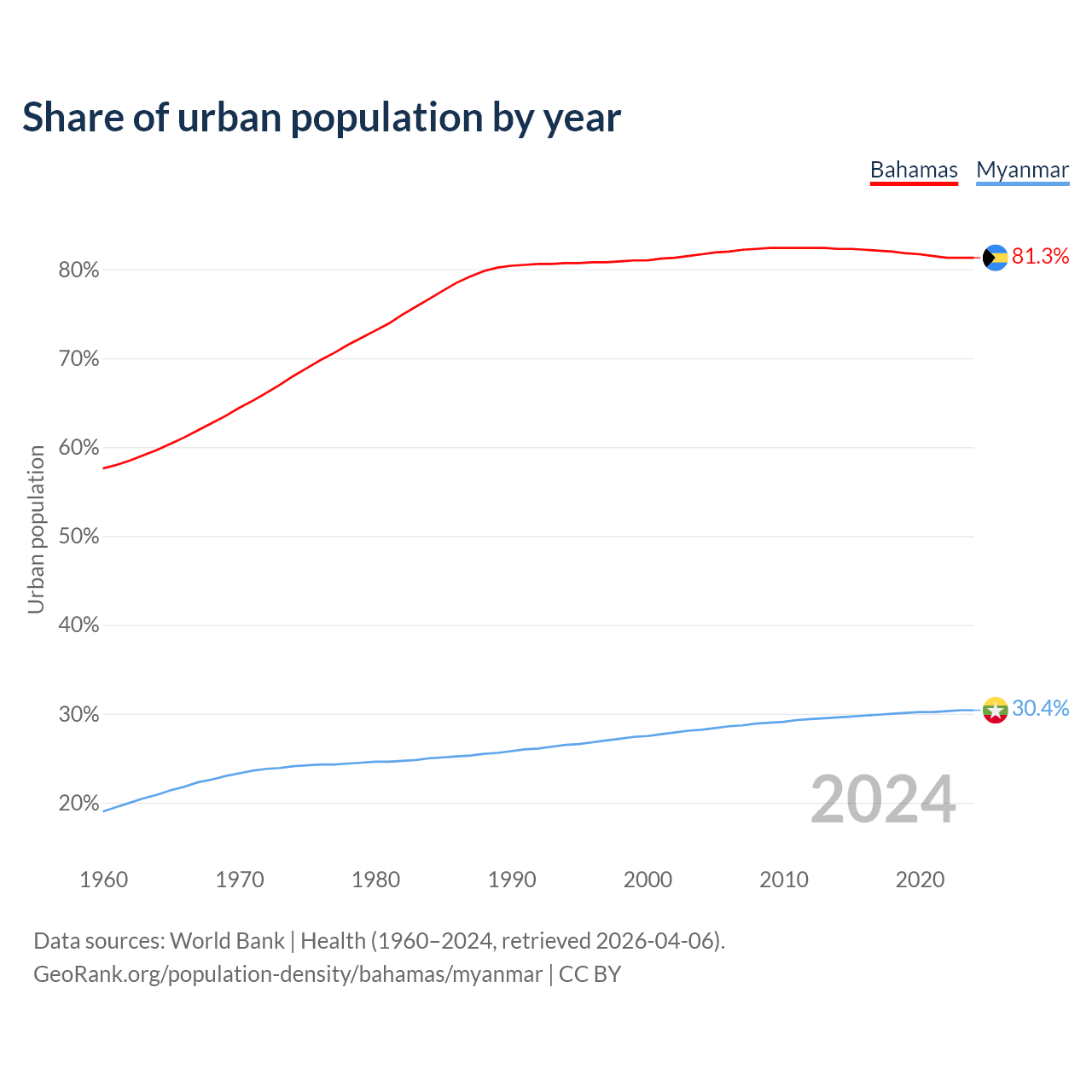 From 2004 to 2024, the share of urban population changed from 81.7% to 81.3% in the Bahamas and from 28.2% to 30.4% in Myanmar.