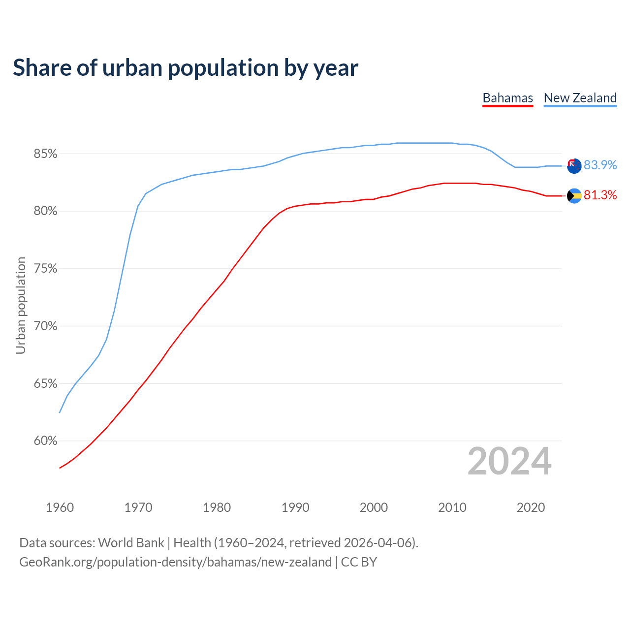 From 2004 to 2024, the share of urban population changed from 81.7% to 81.3% in the Bahamas and from 85.9% to 83.9% in New Zealand.