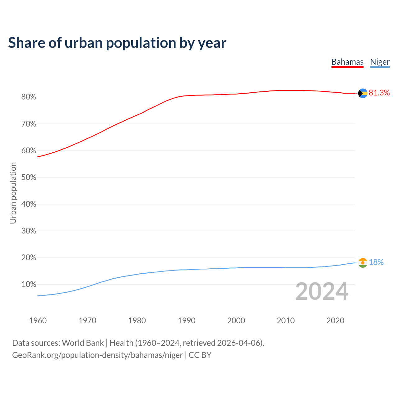 From 2004 to 2024, the share of urban population changed from 81.7% to 81.3% in the Bahamas and from 16.3% to 18% in Niger.