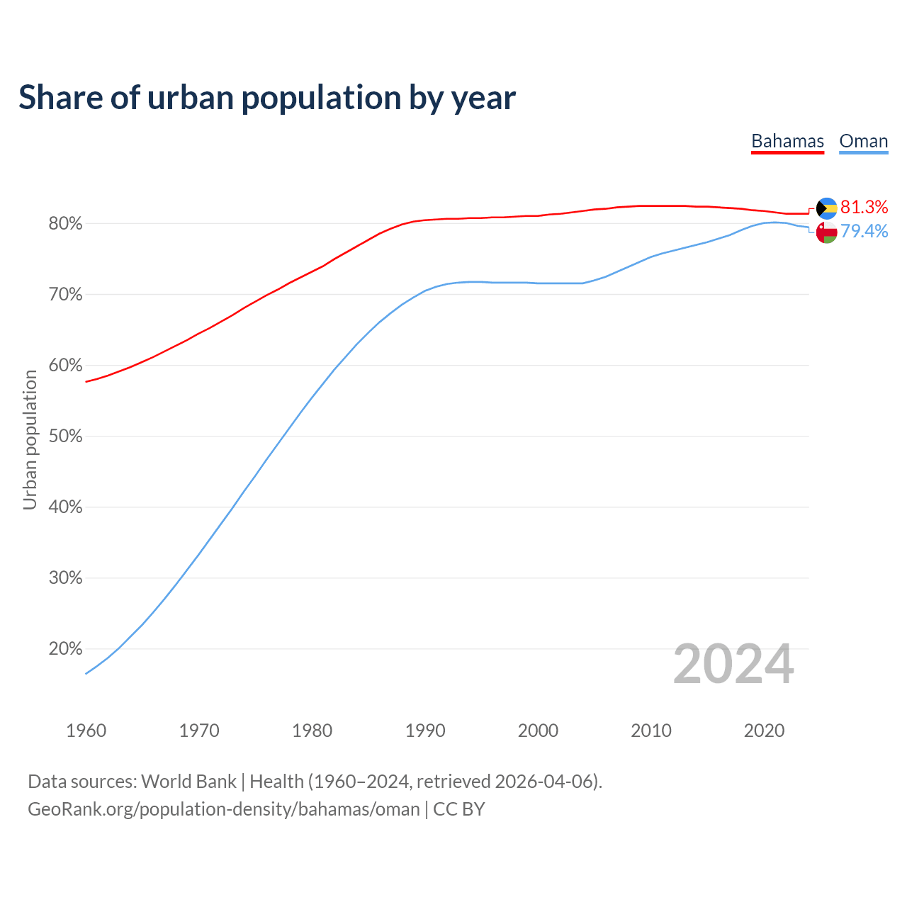 From 2004 to 2024, the share of urban population changed from 81.7% to 81.3% in the Bahamas and from 71.5% to 79.4% in Oman.