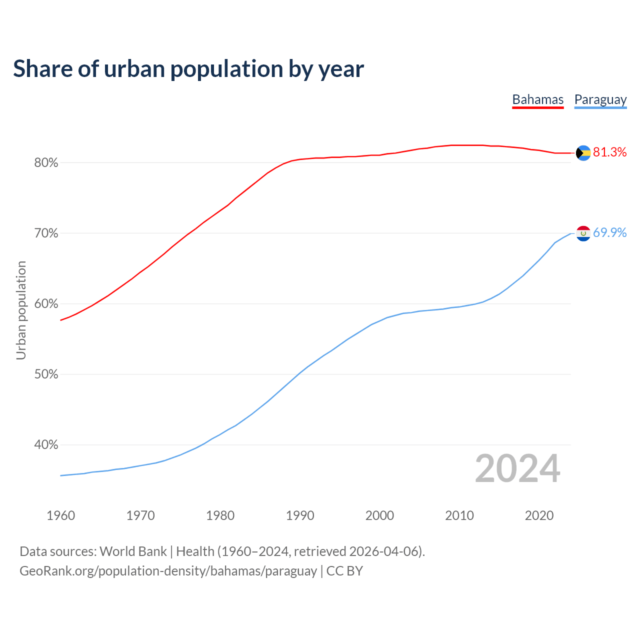 From 2004 to 2024, the share of urban population changed from 81.7% to 81.3% in the Bahamas and from 58.7% to 69.9% in Paraguay.