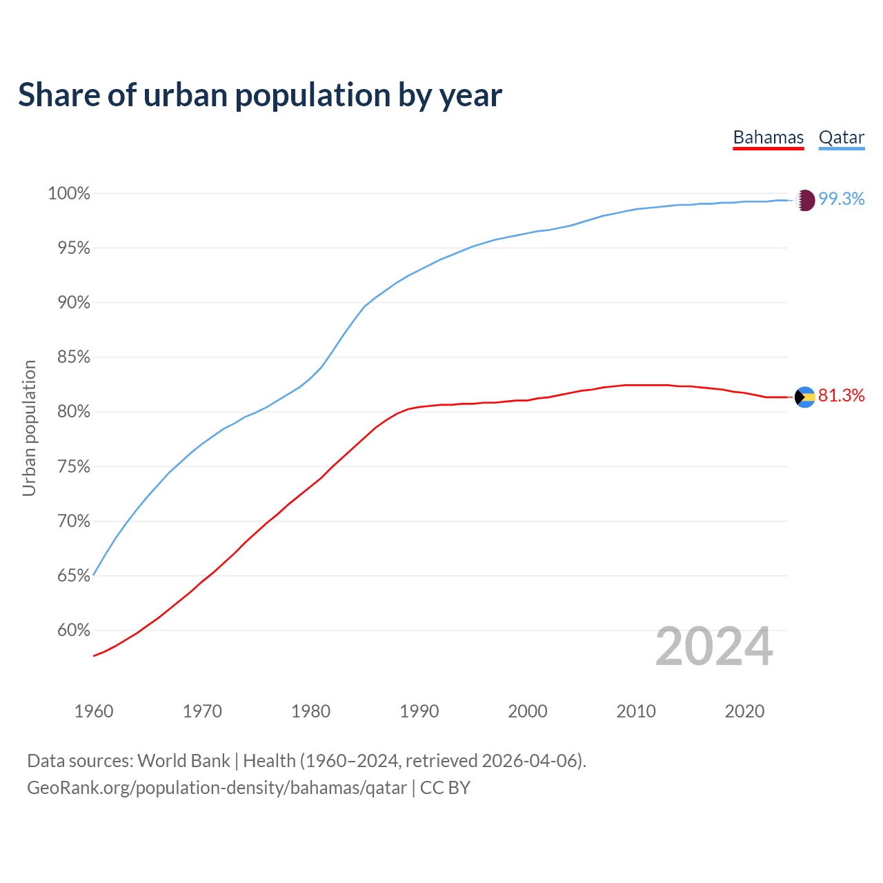 From 2004 to 2024, the share of urban population changed from 81.7% to 81.3% in the Bahamas and from 97% to 99.3% in Qatar.