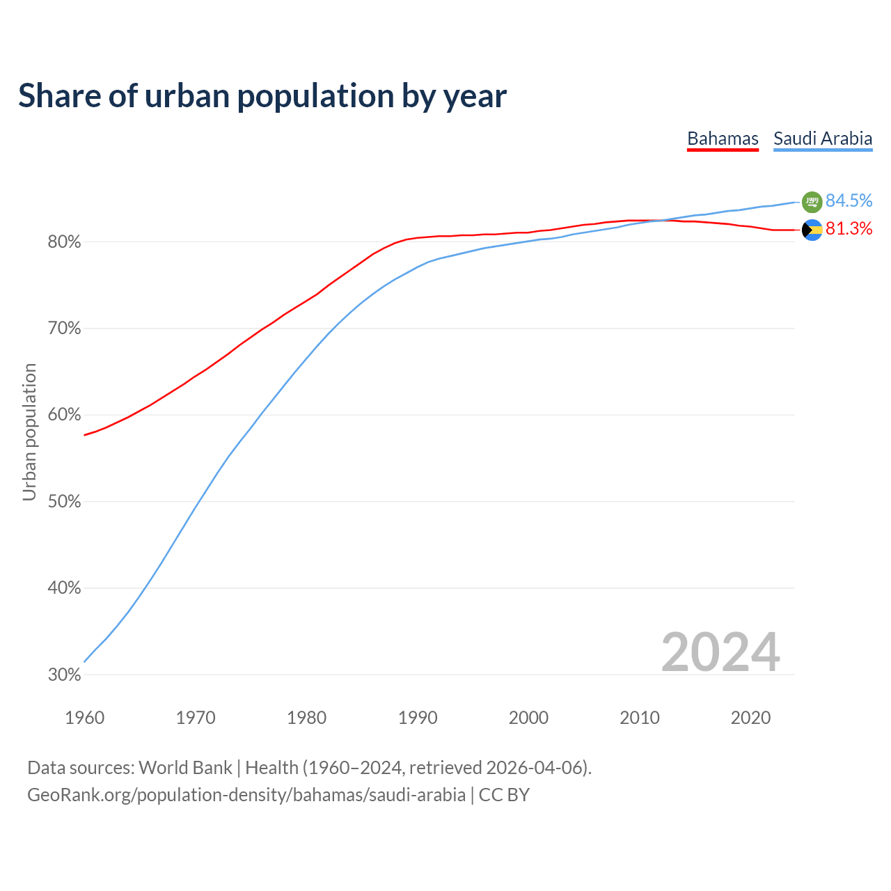 From 2004 to 2024, the share of urban population changed from 81.7% to 81.3% in the Bahamas and from 80.8% to 84.5% in Saudi Arabia.