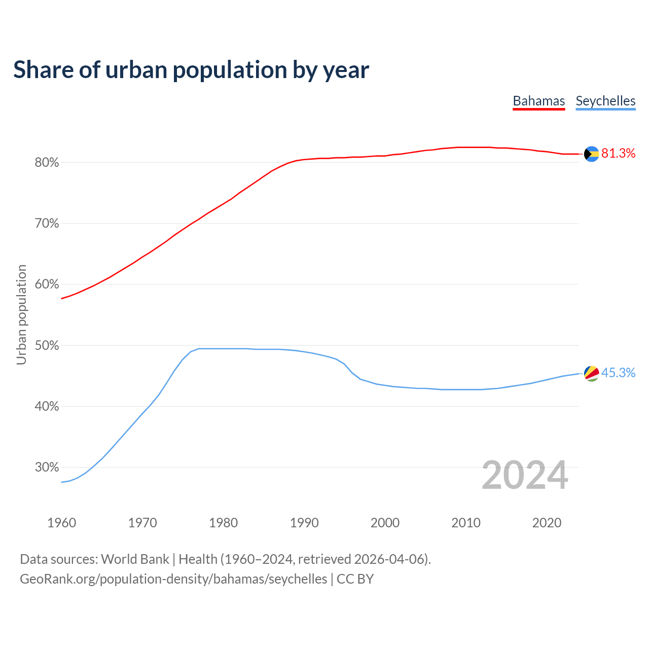 From 2004 to 2024, the share of urban population changed from 81.7% to 81.3% in the Bahamas and from 42.9% to 45.3% in the Seychelles.
