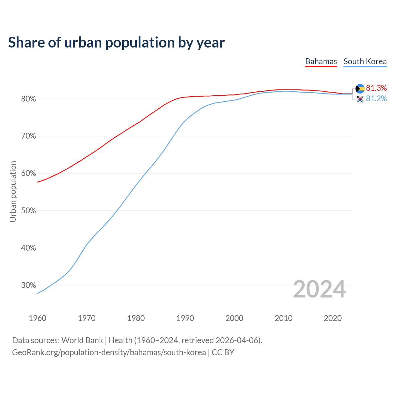 From 2004 to 2024, the share of urban population changed from 81.7% to 81.3% in the Bahamas and from 81.1% to 81.2% in South Korea.